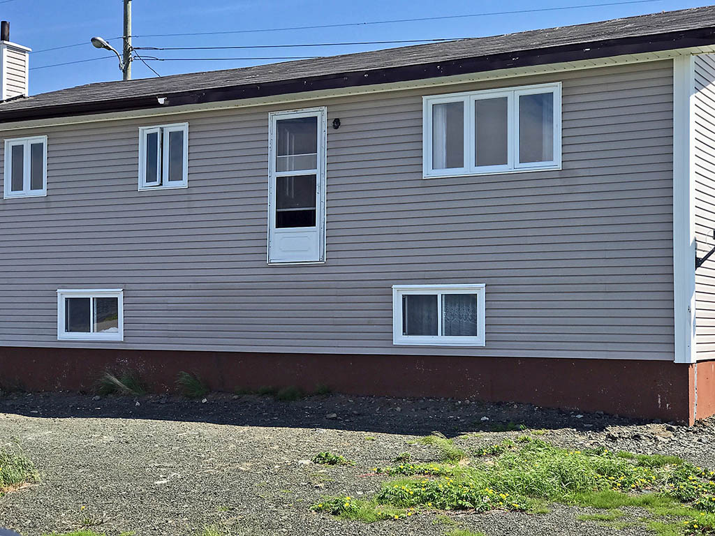 As part of Newfoundland joining the Confederation, building codes required front and back doors for fire safety, but did not specify that steps were required. Since the traditional entrance is via a mud-room next to the kitchen, the mandated doors are often left as pictured.